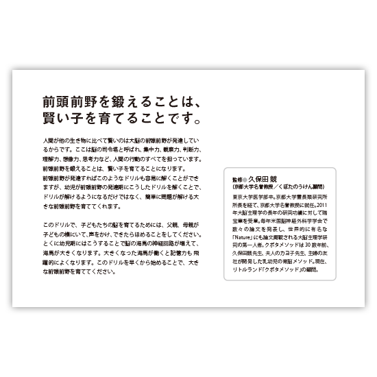 久保田競先生監修、京都幼児教室オリジナルのドリルです。ドリルを使用することで、集中力・記憶力・観察力・思考力・想像力など、前頭前野の機能を高めることが期待できます。早い時期よりドリルをスタートし、大きな前頭前野を育てましょう!